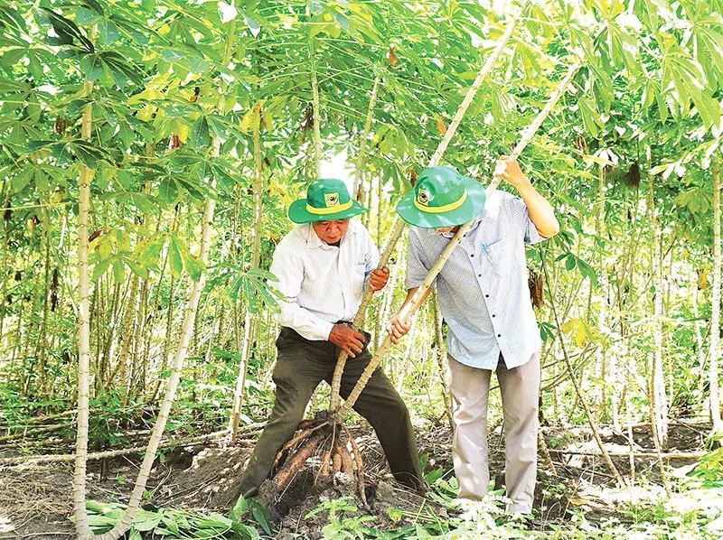Agricultural extension officers inspect the growth process of cassava plants.  At the same time, the industry is also developing model projects nationwide in the cultivation, care, and processing of cassava starch for export.